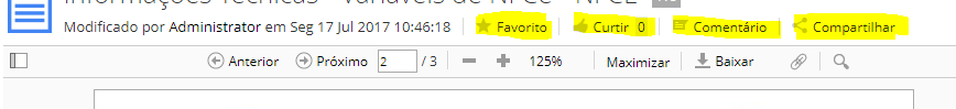 Como posso editar as opções favorito, curtir, comentário e compartilhar na página de visualização de documentos?