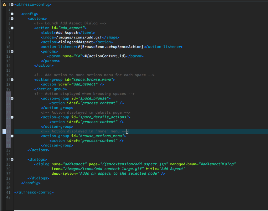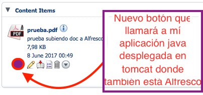 La cuestión ahora es que no se que debe contener el actionExecuter.java para que cuando el usuario haga click en el botón que tiene asignado este nuevo action, éste a su vez llame a mi aplicación java desplegada en alfresco. He probado los WebScrip y los ejemplos me funcionan, pero ¿cómo asigno un WebScrip a un botón? y ¿se puede hacer hace con WebScript o se hace con Action?