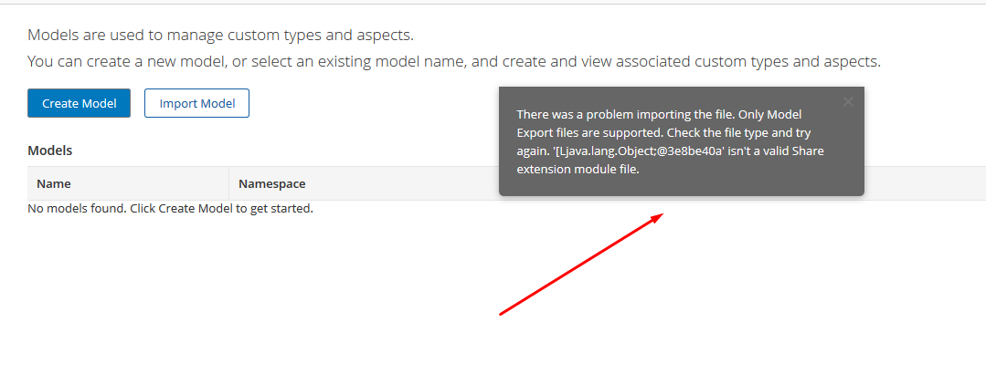 Estou a tentar importar um modelo de tipos que fiz no Model Manager e que exportei previamente, mas estou a obter o seguinte erro. Nesta instalação do Alfresco, não existe nenhum modelos.