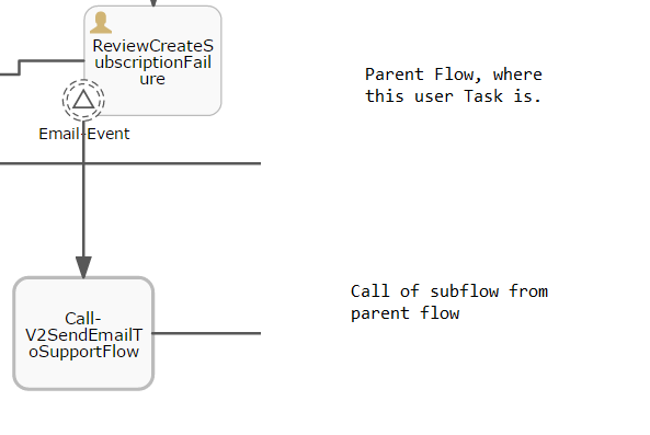 My subflow should have "Start Signal Event" instead of #2 above. Which would be starting the subflow automatically when it sees an event getting fired from Task listener, as illustrated below